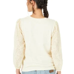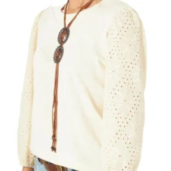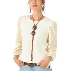 Women’s Wrangler Eyelet Poet Sleeve Top has the comfort and ease of a tee plus beautiful full sleeves with eyelet detail. Western/boho-inspired Eyelet Poet Sleeve Top brings value to your wardrobe with its versatility and perfect creamy light tan color. It couldn’t be easier to create an outfit with jeans, shorts, or skirts and you can dress it up or down as you like.