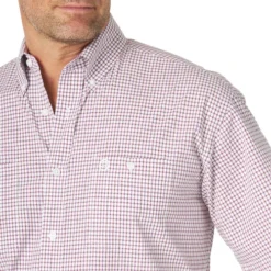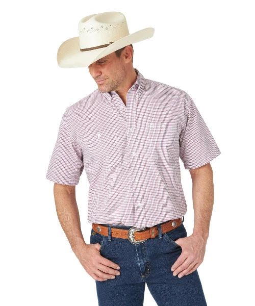 The Men’s Wrangler George Strait Short Sleeve Shirt is a Western performance shirt with relaxed fit, button down collar, and mini plaid print. Versatile short sleeve Western riding shirt is ready for competition with moisture wicking, quick drying fabric and UPF 30+ sun protection. The mini check print in a white and fuchsia combination has a tiny hint of pale green that gives it subtle depth and liveliness. Part of the George Strait Collection at Wrangler, this is a great shirt for summer riding, competition, and office wear.
