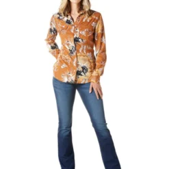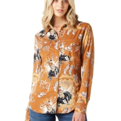 Women’s long sleeve Wrangler Long Live Cowboys Rayon Shirt will float softly over a tank and T-shirt and transition from day activities to a night on the town. The cowgirl snap shirt is a medium weight and silky, with a fluid movement that makes it look pretty worn loose as well as tucked in. The print is the center of attention but the classic Western elements like single point yokes and black enamel snaps are right there, too. Cute Wrangler Long Live Cowboys Rayon Shirt for riding and fashion has a great sense of retro style and fun!