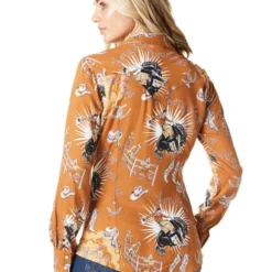 Women’s long sleeve Wrangler Long Live Cowboys Rayon Shirt will float softly over a tank and T-shirt and transition from day activities to a night on the town. The cowgirl snap shirt is a medium weight and silky, with a fluid movement that makes it look pretty worn loose as well as tucked in. The print is the center of attention but the classic Western elements like single point yokes and black enamel snaps are right there, too. Cute Wrangler Long Live Cowboys Rayon Shirt for riding and fashion has a great sense of retro style and fun!
