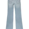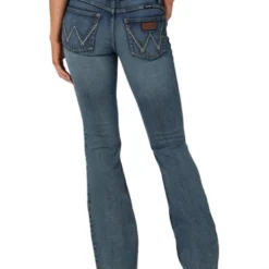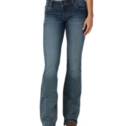 Wrangler Retro Sadie Bootcut Jeans in medium Kinsley denim wash have a low rise fit and versatile look for ranch and town. Not only are they cute, they are stretchy and comfortable for riding. They fit closely from hip to knee then release to a wider lower leg. Women’s bootcut Western jeans are curvy, flirty, and made with durable cotton-rich denim.